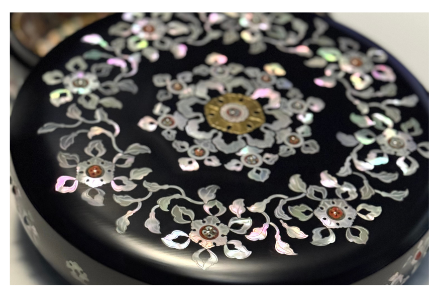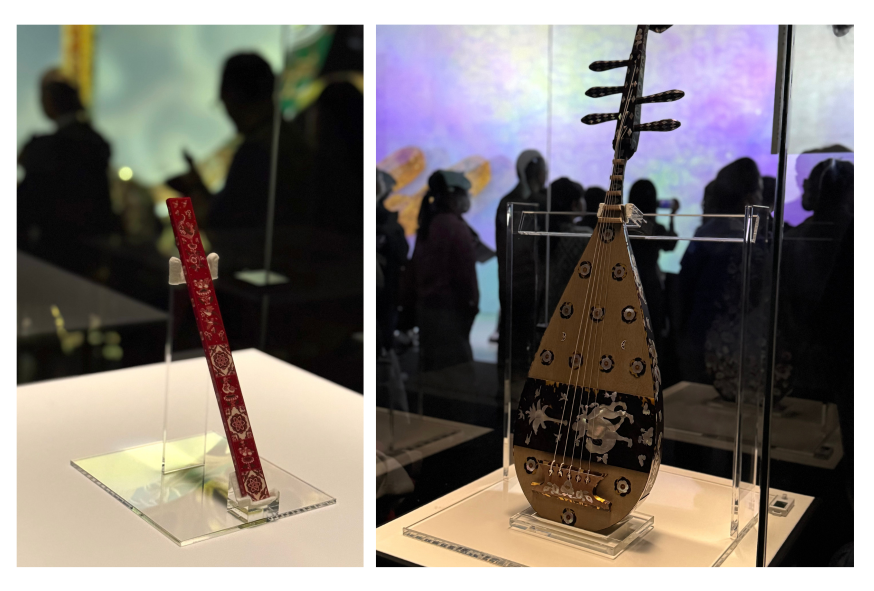 螺鈿(らでん)細工の美しい箱、ラクダに乗って琵琶を弾く人が描かれた螺鈿紫檀五絃琵琶(らでんしたんのごげんびわ)、そして紅牙撥鏤尺(こうげばちるのしゃく)には、ギリシア・ローマ神話にも登場する天馬が描かれているとのこと。